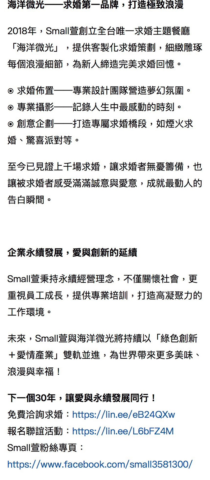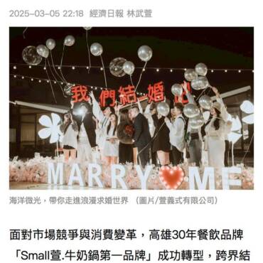 由擁有30年品牌底蘊的Small萱幸福團隊,於 2018 年創立,首創全台唯一的求婚主題餐廳,讓每一次告白,不只是浪漫瞬間,更是一場為愛而生的使命。