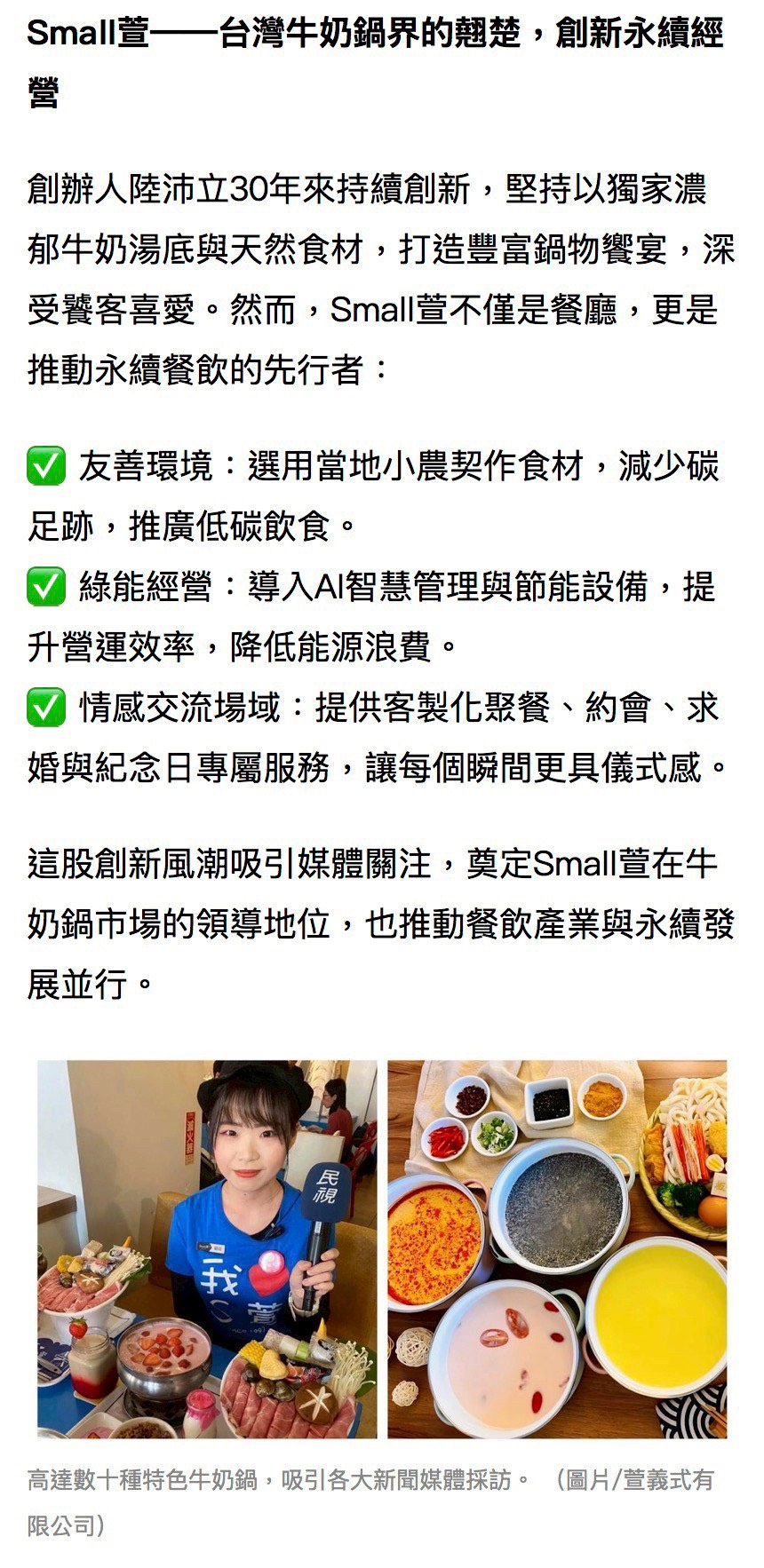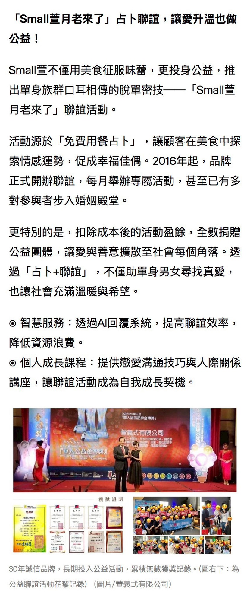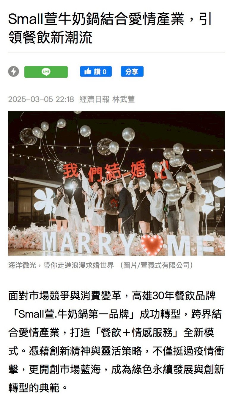 創立於 1997 的 Small萱牛奶鍋第一品牌,30 年來以「幸福可以被傳遞」為信念。2016 年,我們將占卜結合聯誼,誕生了全台唯一的「Small萱月老來了」。在輕鬆用餐中探索情感,讓緣分自然發生,已有多對戀人步入婚姻。